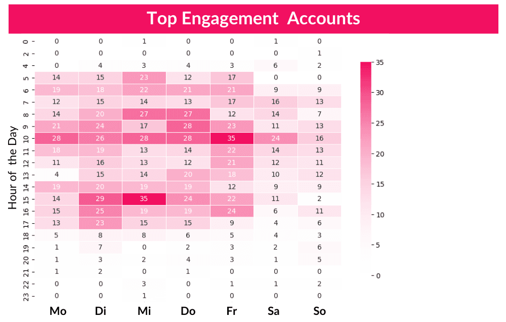 Unsere Top-Engagement Accounts hatten eine Engagement Rate von 10.4%. Der Durchschnitt aller Accounts 2.12%. Spannend, die Top-Wachstums-Accounts hatten dennoch ein Engagement von 7.25%. Kommentar zur Berechnung: die Engagement Rate bezieht sich auf die Follower, nicht auf die effektive Reach.
