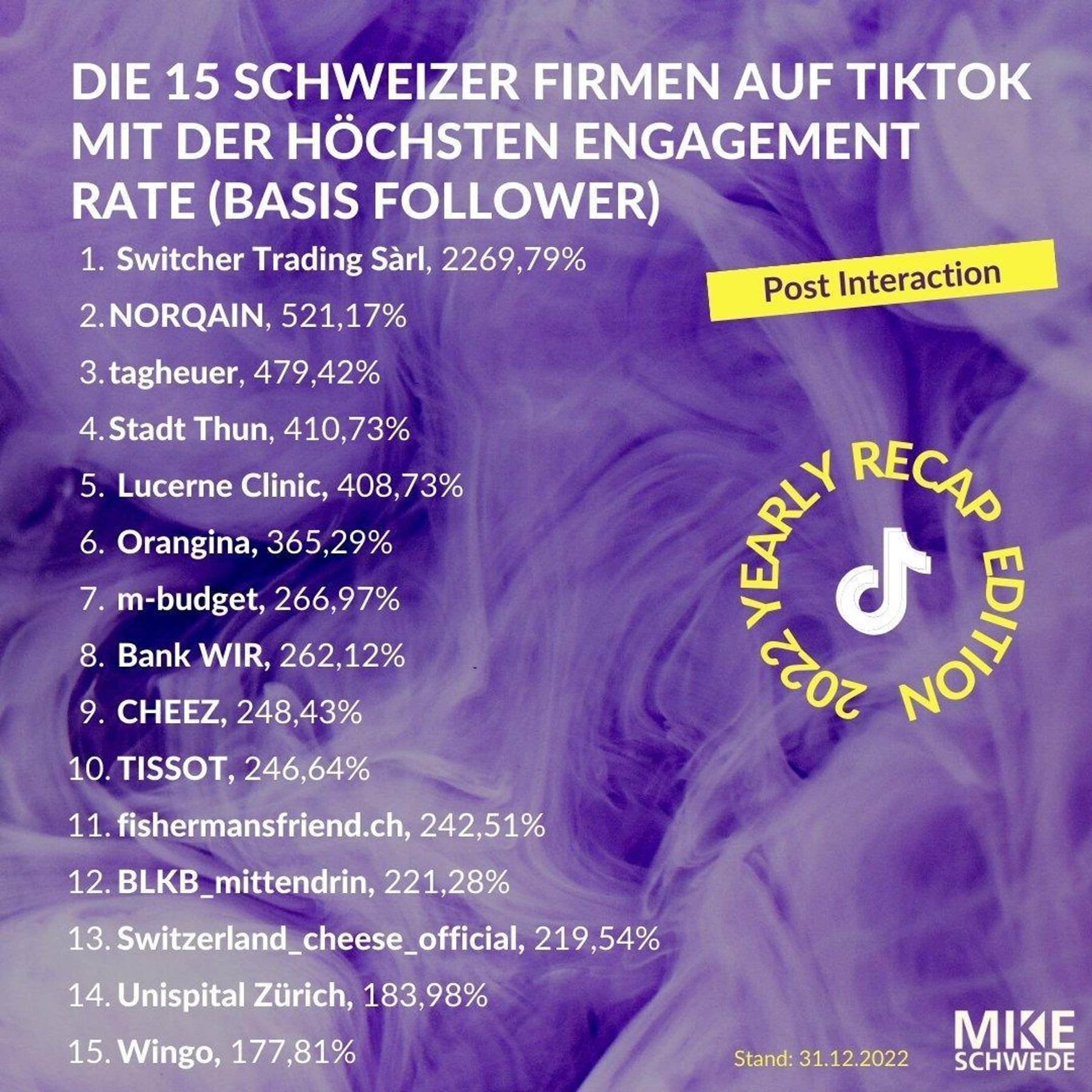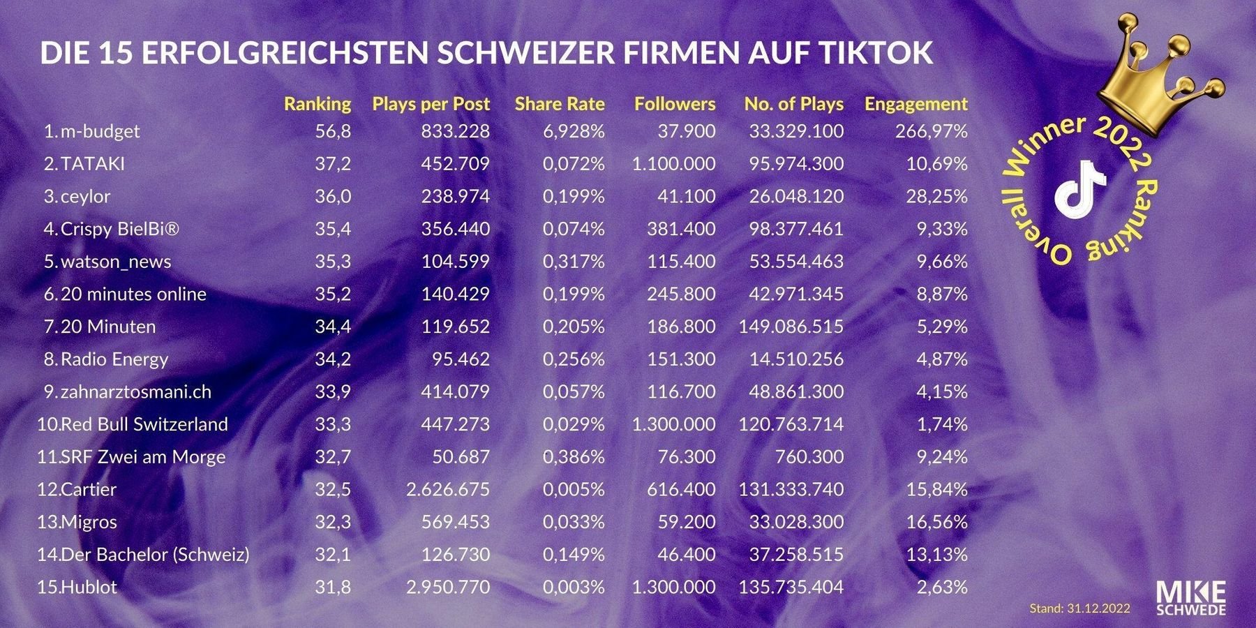 Welche Schweizer Firmen und Organisationen sind aktiv und erfolgreich auf TikTok? Wir haben 220 Schweizer Firmen das ganze Jahr 2022 auf TikTok getrackt. Hier ist unser Ranking und Findings.